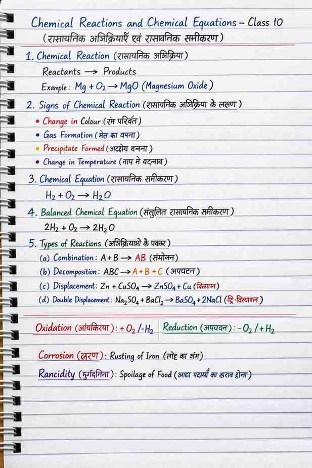 Chemical Reactions and Chemical Equations Class 10 Notes (Hindi + English)