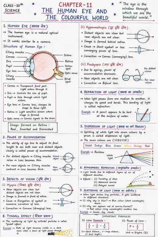 “Human Eye and Colourful World Notes” Class 10 Science का एक बेहद महत्वपूर्ण चैप्टर है, जो हमें यह समझने में मदद करता है कि हम इस खूबसूरत और रंगीन दुनिया को कैसे देख पाते हैं। इस अध्याय में मानव नेत्र की संरचना (Structure of Human Eye), उसकी कार्यप्रणाली, दृष्टि दोष (Vision Defects) जैसे Myopia और Hypermetropia, तथा उनके सुधार के तरीके को सरल भाषा में समझाया गया है।